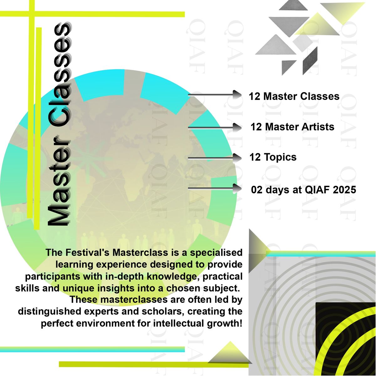 QIAF participants are invited to apply for a Master Class presentation during the festival. There is NO additional Fee for this activity. This is an excellent platform to share your knowledge, present your creative journey, demonstrate your skills, or showcase your work in specialized fields such as: