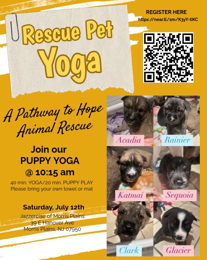 PUPPY YOGA at Morris Plains JAZZERCISE Saturday July 12. Join us for one session of Puppy Yoga 10:15 am. Meet some of Pathway's adorable adoptable puppies as well as some that have found their forever homes! Class Fee: $25 per person.